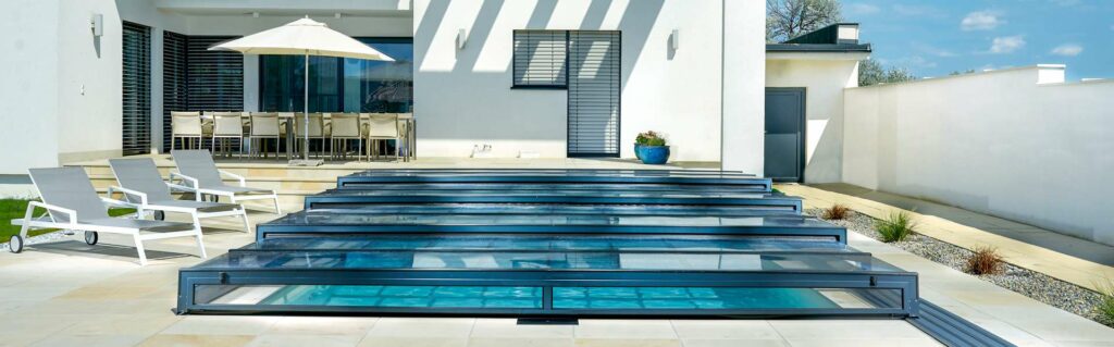 Prestige är från början utrustat med en säker låsanordning så ingen olycka sker. Med taket kommer det med extraskenor så du lätt kan skjuta undan taket bortanför själva poolen. Prestige finns bara i klarglas och på stommen finns det tre färger att välja mellan – silver, antracit och champagne.